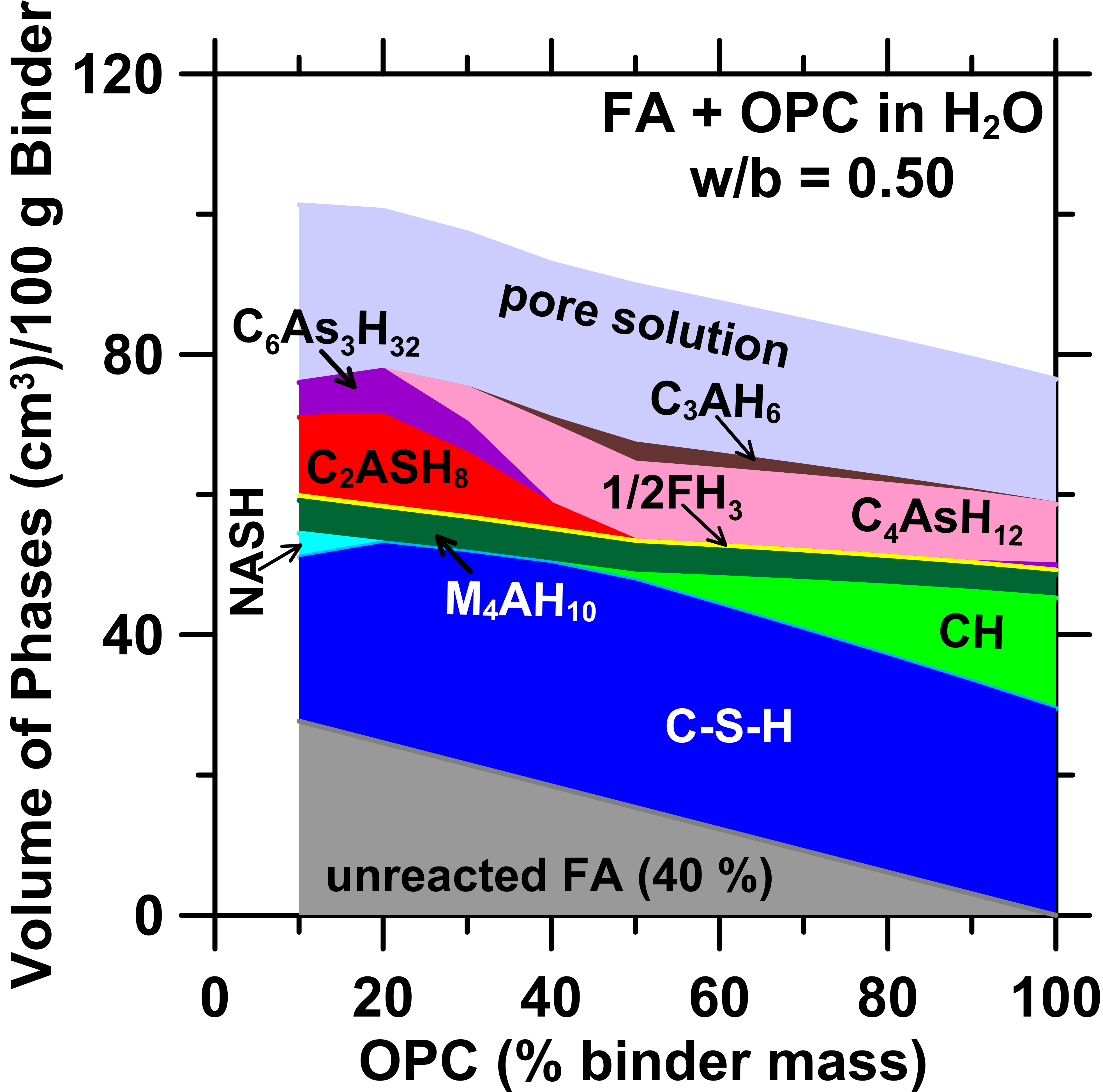 Cementitious binders are often used to immobilize industrial wastes such as residues of coal combustion. Such immobilization stabilizes wastes that contain contaminants by chemical containment, i.e., by uptake of contaminants into the cementitious reaction products. Expectedly, the release (“leachability”) of contaminants is linked to: (i) the stability of the matrix (i.e., its resistance to decomposition on exposure to water), and, (ii) its porosity, which offers a pathway for the intrusion of water and egress of contaminant species. To examine the effects of the matrix chemistry on its suitability for immobilization, an equilibrium thermodynamics-based approach is demonstrated for cementitious formulations based on: ordinary portland cement (OPC), calcium aluminate cement (CAC) and alkali activated fly ash (AFA) binding agents. First, special focus is placed on computing the equilibrium phase assemblages using the bulk reactant compositions as an input. Second, the matrix’s stability is assessed by simulating leaching that is controlled by progressive dissolution and precipitation of solids across a range of liquid (leachant)-to-(reaction product) solid (l/s) ratios and leachant pH’s; e.g., following the LEAF 1313 and 1316 protocols. The performance of each binding formulation is evaluated based on the: (i) relative ability of the reaction products to chemically bind the contaminant(s), (ii) porosity of the matrix which correlates to its hydraulic conductivity, and, (iii) the extent of matrix degradation that follows leaching and which impact the rate and extent of release of potential contaminants. In this manner, the approach enables rapid, parametric assessment of a wide-range of stabilization solutions with due consideration of the matrix’s mineralogy, porosity, and the leaching (exposure) conditions. |