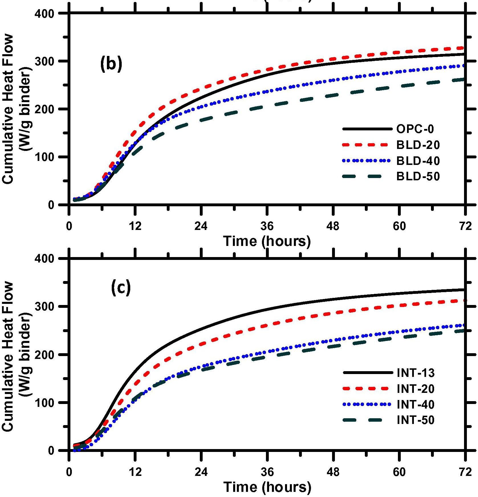 The influence of high volume cement replacement using a combination of slag and limestone, on the hydration, reaction products and pore structure, and strength of cementitious systems is reported in this paper. Total replacement levels vary from 20% to 50% by volume. Slag is blended with: (i) Portland-limestone cement (PLC) that contains limestone interground with cement, or (ii) OPC and limestone of four different sizes in such a way that the resulting particle size distribution of the composite matches that of the corresponding PLC-based mixture. The hydration response of cement and cement–slag mixtures are found to be modified in the presence of limestone. It is observed from calorimetric and thermogravimetric analysis that a favorable slag–limestone synergy exists, that enables high volume replacement of cement without concomitant loss in properties. The early-age compressive strengths are beneficially impacted by the presence of limestone whereas the clinker factor does not play a significant role in later-age strengths in both the blended and interground systems. The study paves the way for development of multiple-material binders containing higher levels of cement replacement that demonstrate early and later age properties that are comparable to or better than that of traditional straight cement systems.