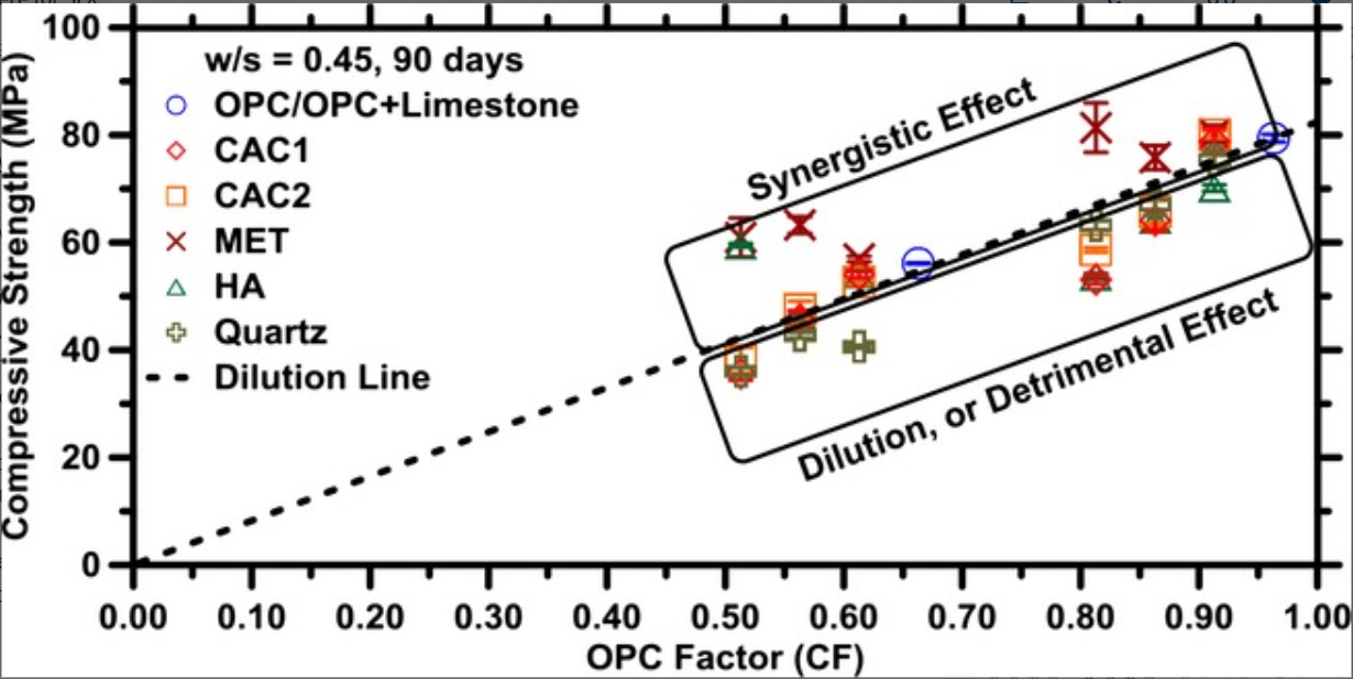 When limestone (CaCO3) is present in ordinary portland cement (OPC), carbonate‐AFm phases (i.e., hemi‐ and/or mono‐carboaluminate) are stabilized at the expense of the sulfate‐AFm, which is more commonly found in cement systems. In OPC, the quantity of AFm hydrates formed is often limited by the availability of aluminum. Therefore, as a means of enhancing AFm phase formation, this study elucidates the role of aluminous sources including: calcium aluminate cements, metakaolin, and a hydratable alumina to determine if their addition would enhance limestone reactions and carbonate‐AFm formation in cement systems. The results of a detailed study including: X‐ray diffraction, strength measurements, thermogravimetric analysis, and thermodynamic calculations are used to quantify solid phase constitutions, and the extent of limestone reacted. The results suggest that, the amount of limestone reacted and the specific carbonate‐AFm formed is sensitive to both, the nature of the aluminous source and limestone content. Pozzolanic reactions which occur when metakaolin is used as an aluminous source are noted to be especially beneficial in offsetting the effects of OPC replacement. It is noted that although the different aluminous materials react with different quantities of CaCO3during hydration, enhanced carbonate‐AFm formation alone is insufficient to ensure strength equivalence, when OPC is replaced by limestone.